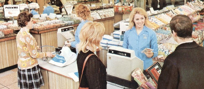 In retail independent thought quickly mutated into self service. Self service had been around since the 50s with Woolworths slowly converting its sweet counters to Pick ‘n’ Mix. It was a slow transition, with a fair amount of opposition, but the 70s witnessed the wholesale abandonment of counter service to self service across all retail, and Pick and Mix as we know it today was born.